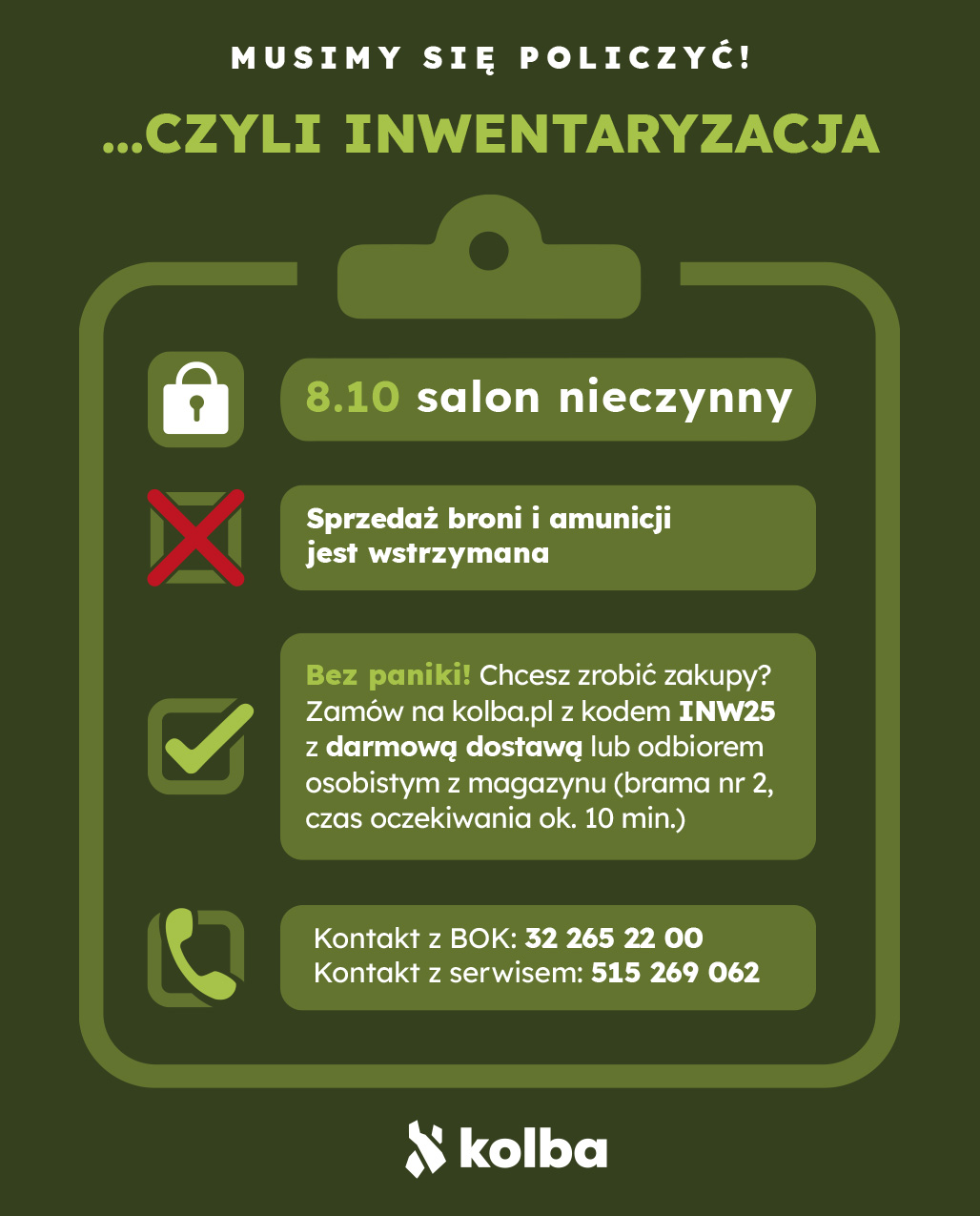 Tego dnia niestety nie będzie można korzystać z naszej zbrojowni - sprzedaż broni i amunicji jest wstrzymana. Ale wciąż możesz odebrać inny asortyment! Cały czas aktywny będzie nasz sklep online kolba.pl. Przygotowaliśmy kupon rabatowy INW25, dzięki któremu skorzystasz z darmowej wysyłki lub będziesz mógł odebrać zamówienie osobiście prosto z naszego magazynu, który znajduje się tuż obok sklepu (brama nr 2, czas oczekiwania na wydanie towaru to ok 10 min.).W razie pytań i wątpliwości skontaktuj się naszym działem BOK: tel. 32 265 22 00.